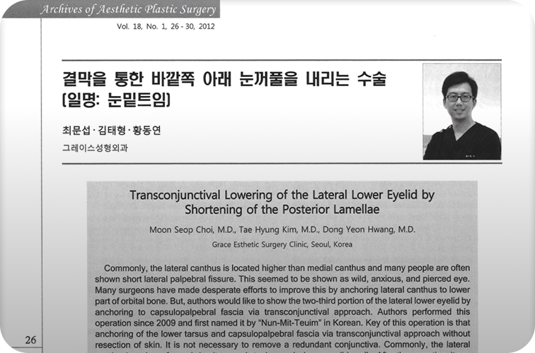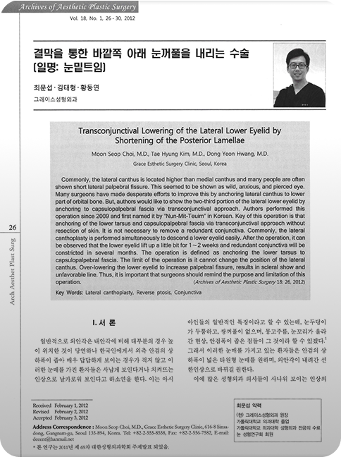 “결막을 통한 바깥쪽 아래 눈꺼풀을 내리는 수술 [일명 : 눈트임]”이란 제목으로 소개되었습니다.